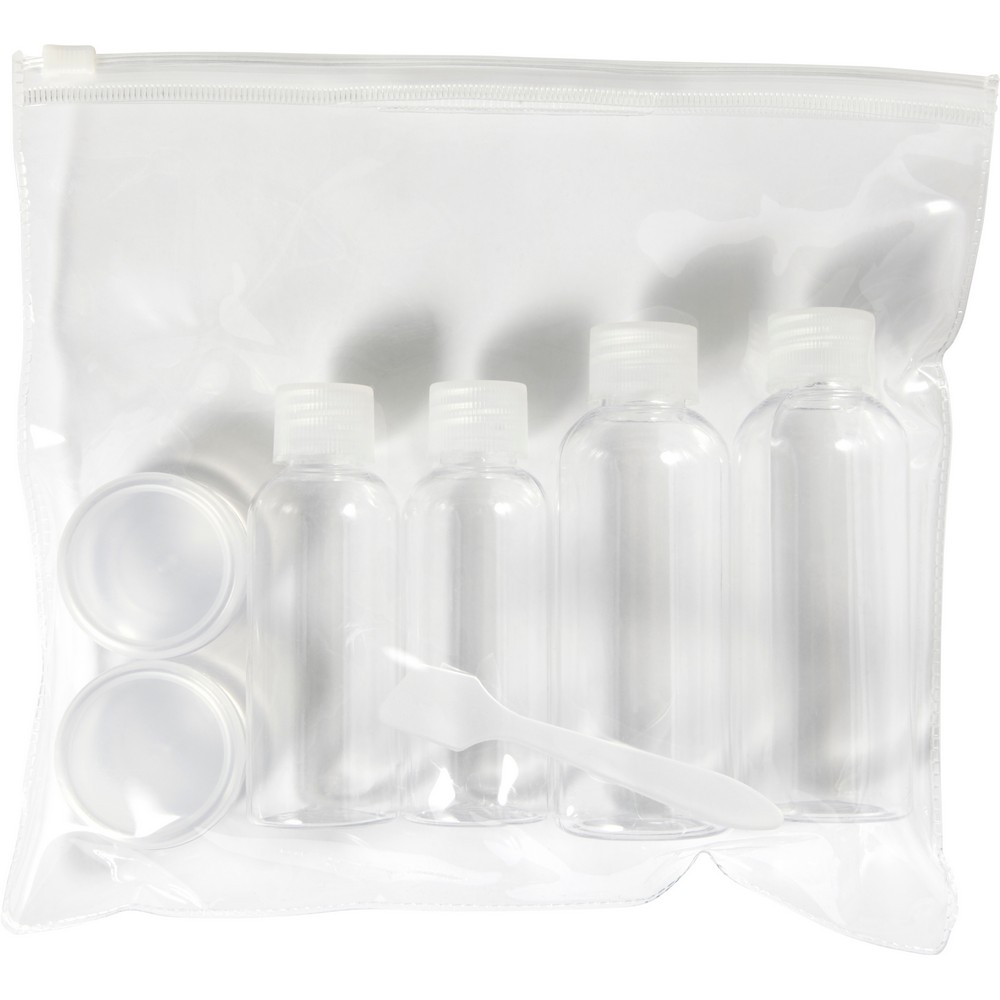 Entdecken Sie unser hochwertiges Kosmetik-Reiseset – der ultimative Werbeartikel für Ihre Marke. Mit einem eleganten, transparenten Container und verschiedenen Flaschen (zwei 100 ml, zwei 50 ml und zwei 10 ml), sowie einer praktischen Spatula, bietet dieses Set alles, was für die persönliche Pflege unterwegs benötigt wird. Die kompakten Maße (20,5 x 18 x 4 cm) und das leichte Gewicht (80 g) machen es ideal für Reisen und den täglichen Gebrauch.